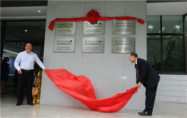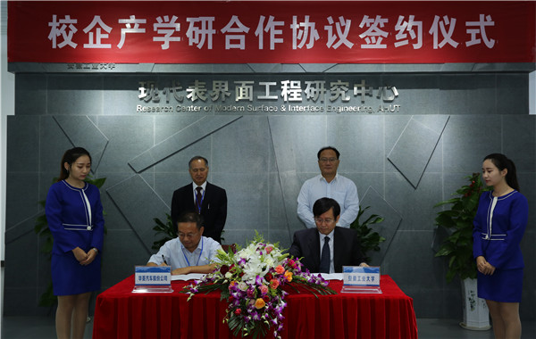魏先文代表学校与六家合作企业的负责人签订了重大产学研战略合作协议,刘新跃和权植哲共同为校-企表界面工程联合实验室揭牌。