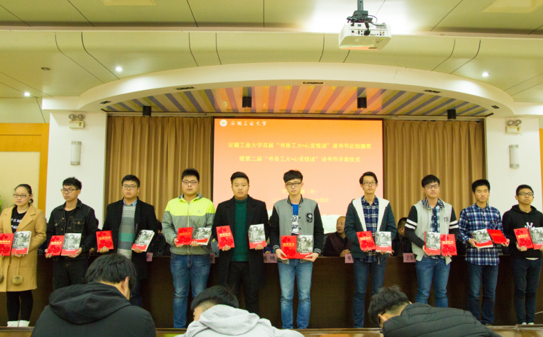 全校共评选出在首届读书节系列活动中涌现出的20位“读书先进个人”。会上宣读了获奖学生名单,并为获奖学生颁发荣誉证书并赠送书籍。会上还宣读了第二届“书香工大·心灵悦读”读书节活动通知。由各学院学生代表领读,全体参会学生共同宣读了读书倡议书。
