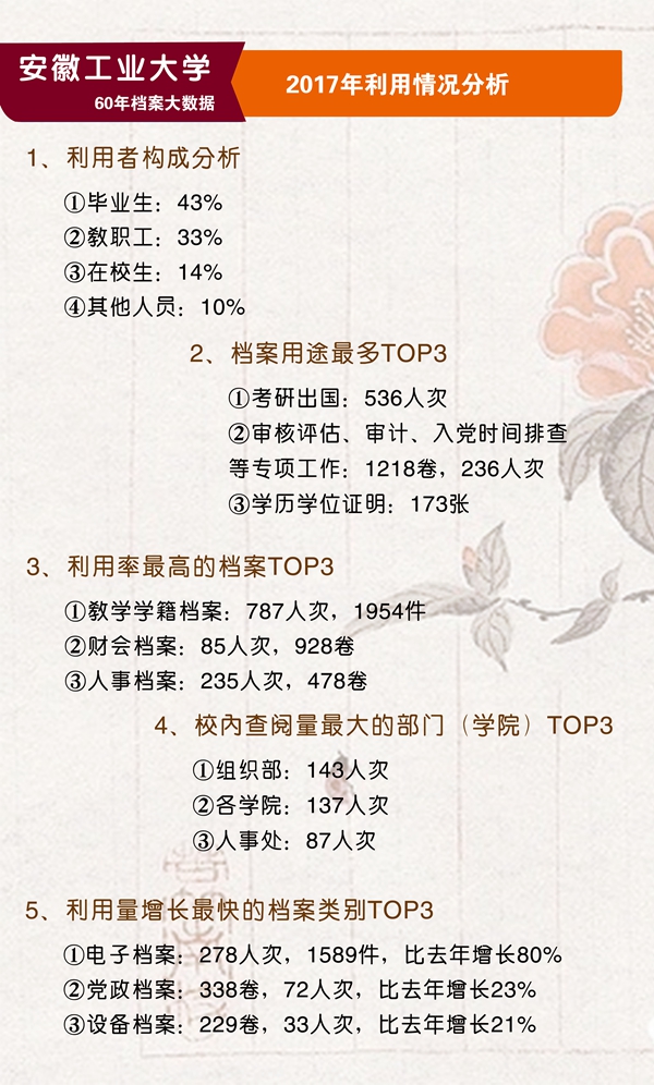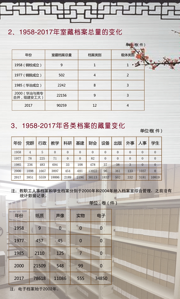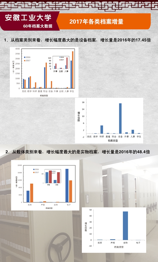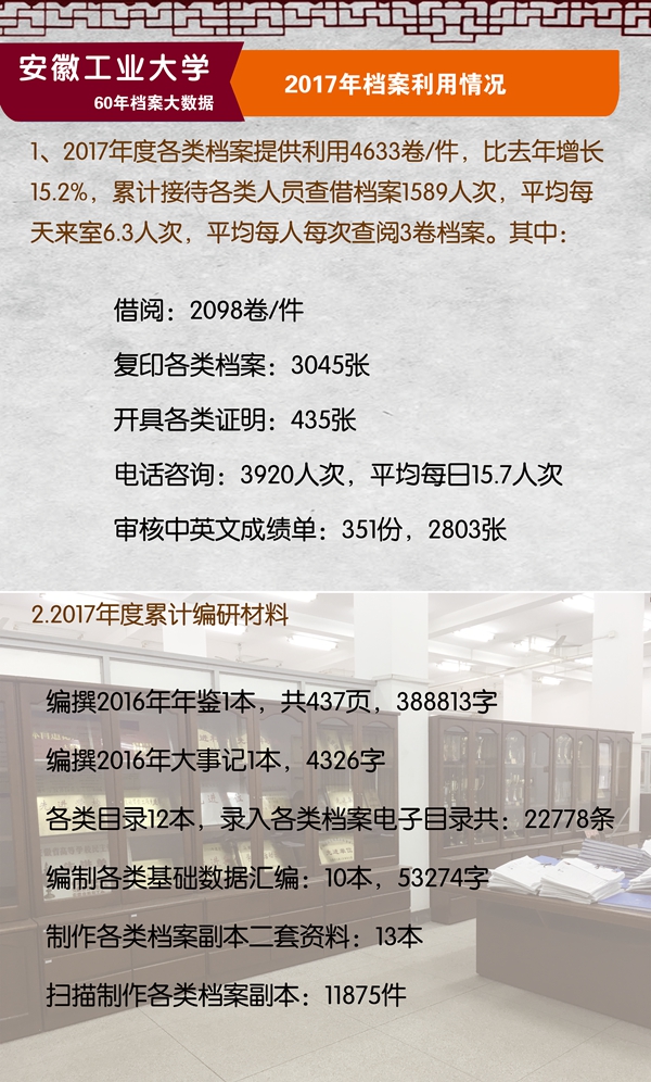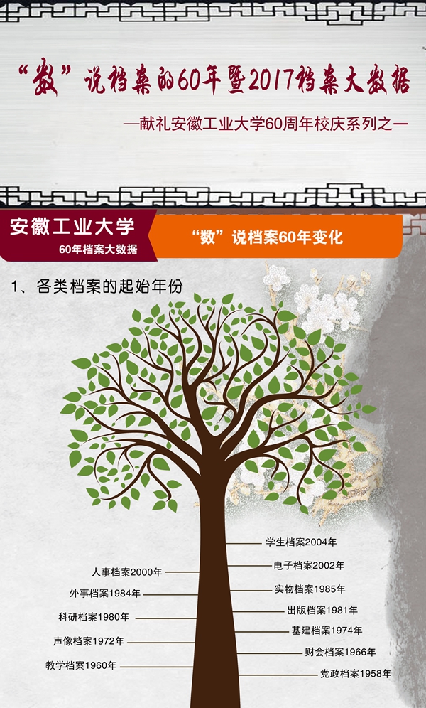 今年,我们将迎来建校60周年,必赢的档案见证了学校一步步地成长。校办档案室综合对比了60年来档案总量、各类档案数量的变化,以钢校建立、钢院建立、华冶建立、安工大组建等时间为节点,制作了直观图表,同时发布了2017年档案室藏总量、分类藏量、年度增量、利用量以利用情况分析等数据。为大家呈现出学校档案种类越来越多、档案藏量越来越丰富、档案利用越来越广泛的变化过程。