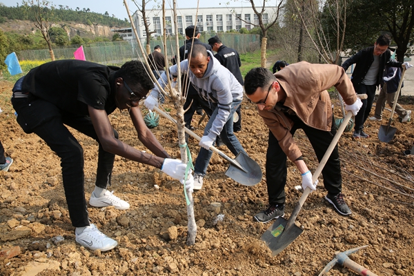 在义务植树现场,大家积极领取劳动工具,兴趣盎然地忙碌起来,有的以石灰点为圆心刨坑、挖土,有的剔除石块和垃圾,捣碎土块培入细土,有的扶正树苗,有的填土、踩实。大家三五结队,分工合作,齐心协力,虽然满头大汗,但情绪高昂,干劲十足。国际教育学院组织了部分留学生也参加了这次义务植树活动。一个多小时后,220多株五色桃、红叶石楠球和垂丝海棠等树木迎风整齐站立,为秀山校区增添了一片新绿。