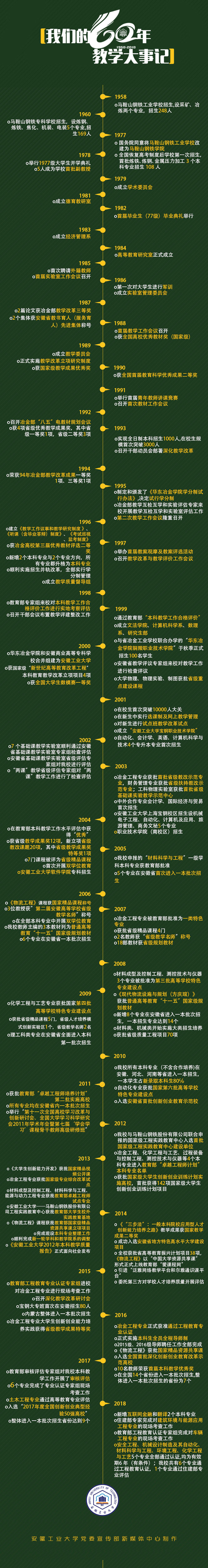 六十载弦歌不辍,薪火相传。六十年的风雨历程,是学校在曲折中奋进,在奋进中发展,在发展中壮大的历史,也是学校教学改革发展不断走向深入的六十年。本期推出教学工作大事记图表,从中可以看到学校各时期的教学改革发展历程。(撰稿:杨凤年 高拥军 制作:新媒体中心 审核:秦锋 邹珏)