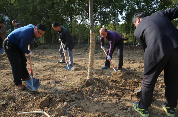 在义务植树现场,大家积极领取劳动工具,兴趣盎然地忙碌起来,有的以石灰点为圆心刨坑挖土,有的剔除石块和垃圾,捣碎土块培入细土,有的将树苗放入坑中,扶正对齐,有的填土踩实,做成树围。大家三五结队,分工合作,齐心协力,虽然撸起袖子,忙得满头大汗,但个个情绪高昂,干劲十足。一个多小时后,160多株香樟、栾树和桂花等树木整齐站立,为桃李山下增添一片新绿。