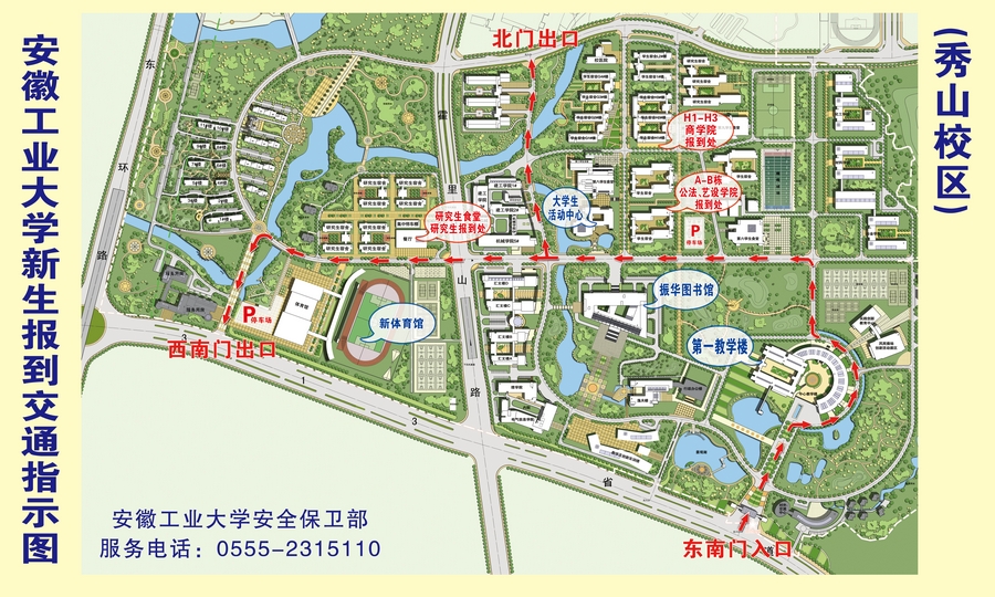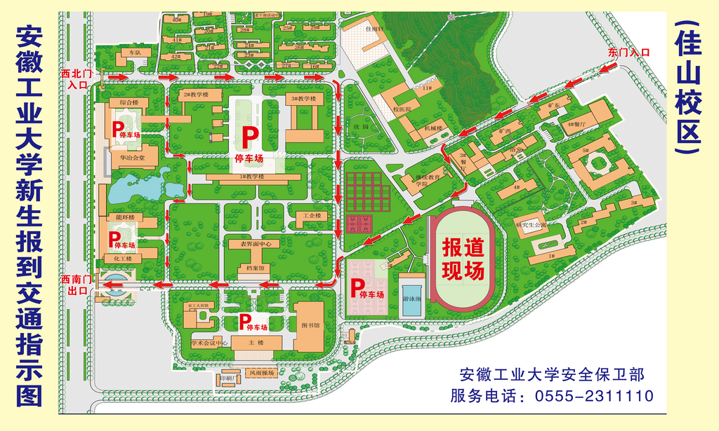 校园机动车实行单向循环。报到车辆统一从东南门进校,从北门或西南门(人才公寓门)离校。车辆行驶路线: