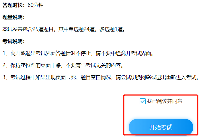 在考试说明界面请点选“我已阅读并同意”、“开始考试”。