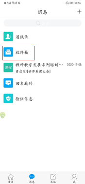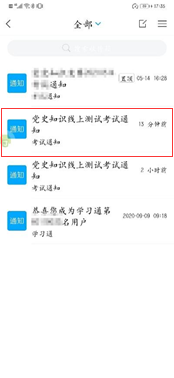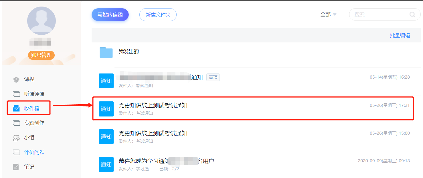 登陆成功后选择“收件箱”,点击“党史知识线上测试考试通知”。