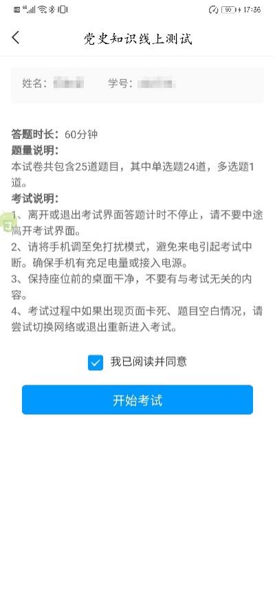 成功登陆后,在主页面点击下方的“消息”按钮,点选“收件箱”,点击“党史知识线上测试考试通知”;然后点击蓝色底色框的“考试”按钮。在考试说明界面请点选“我已阅读并同意”、“开始考试”。