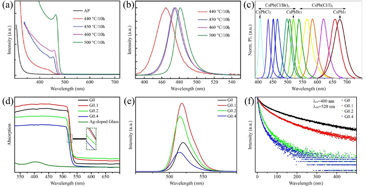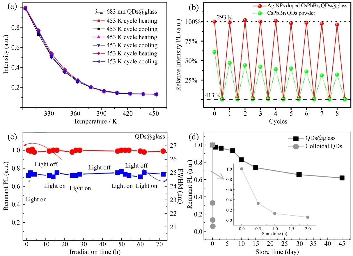 钙钛矿量子点具有带隙可调、高量子效率、超窄半高宽、和超高的发光色纯度等优点,具有广阔的光电应用前景。由于表面存在陷阱缺陷状态以及晶体边界导致稳定性能较差,环境中的水、氧气、紫外线和温度等因素都会使其光电性能大幅度降低。为了改善钙钛矿量子点的稳定性能,通过将钙钛矿量子点原位生长在玻璃基质中,利用无机玻璃致密的网络结构实现对量子点的无缝包覆,将量子点与外界环境隔绝,从而可以有效地解决量子点的稳定性问题,使其表现出优异的光稳定性、耐水性和耐热性,在照明与显示、激光与传感器等领域具有更加广阔的应用前景。