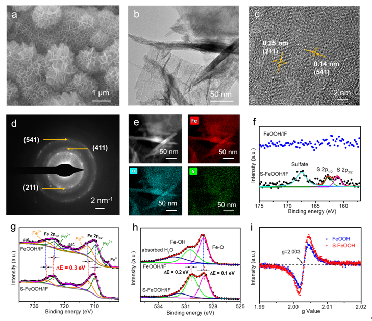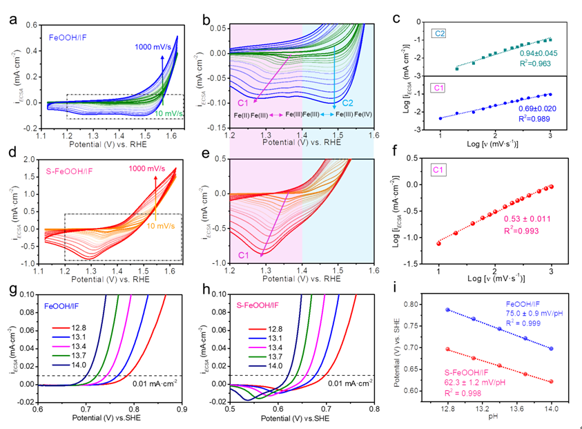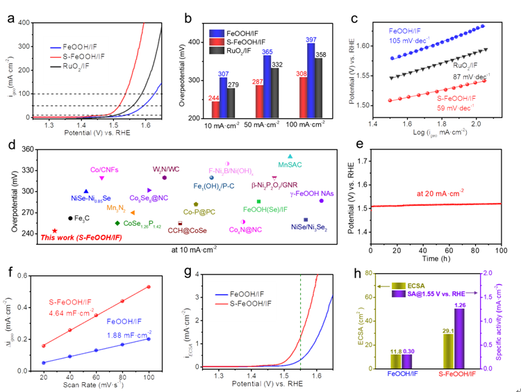 电解水制氢是目前获取可再生清洁氢能源的有效方式之一,是实现“碳达峰、碳中和”宏伟目标的重要途经。本论文针对目前商用钌铱等贵金属催化剂成本高、资源少、耐久性差等问题,提出采用化学腐蚀法在泡沫铁基底原位生长垂直于基底的硫掺杂羟基氧化铁纳米片(S-FeOOH)。系统的结构表征、电化学性能测试和理论模拟计算结果表明,FeOOH中铁和晶格氧反应活性都得到了充分激活,从而显著提高了本征OER活性,所得催化剂在10 mA cm−2电流密度下的过电位仅为244 mV。此工作提供了一种简单高效的表面工程策略获得低成本、高性能的OER电催化剂。