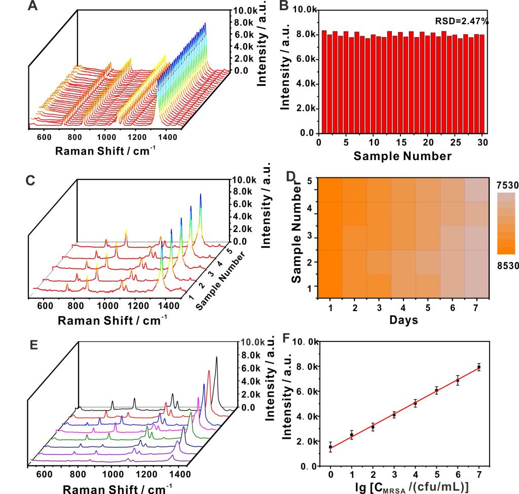 团队针对目标细菌选择了匹配的核酸适配体,利用酶切DNA反应破坏了修饰拉曼染料的金纳米粒子稳定性,构建了基于DNA分子机器的表面增强拉曼散射传感平台用于快速检测MRSA。目标细菌可以与适配体结合并置换出两条适配体互补链,DNA分子机器上修饰的发卡DNA与适配体互补链结合后会被外切酶Ⅲ水解并激活,激活的DNA分子机器会在外切酶Ⅲ的帮助下在修饰了拉曼染料和保护DNA链的金纳米粒子上通过消耗保护DNA实现行走,随着保护DNA链的消耗金纳米粒子会被镁离子诱导发生聚集产生大量3D SERS热点,大幅度提升拉曼染料的信号。通过分析拉曼信号的变化,可以精确分析100-107cfu/mL浓度范围的MRSA,通过核酸信号多级扩增和DNA分子机器实现了对低浓度细菌的快速检测。