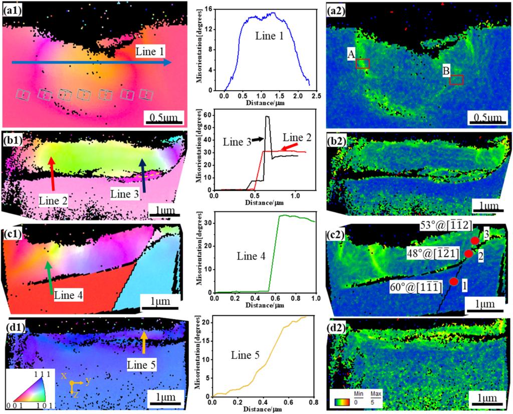 研究人员利用聚焦离子束技术(FIB)在奥氏体不锈钢的单个晶粒内部和含有孪晶界的双晶(bi-grains)上制备出了一系列的微墙,其宽度约为1.7µm、长度约为20µm、深度约为12µm。之后,使用尖端半径为5µm的楔形压头在非原位纳米压痕设备KLA G200上进行了划痕实验。经过对划痕试样的表征与分析,发现在单道次微墙划痕实验中出现了宏观实验中类似的位错墙,充分地验证了新设计的微观摩擦实验方法的可行性和合理性。此外,实验的研究成果表明:位错墙的形成和长大行为取决于摩擦方向(晶粒取向和划痕方向);细小晶粒在位错墙处形成;孪晶界强烈地影响位错墙行为,并改变孪晶界附近的局部塑性。研究成果不仅为提供微型元器件减磨耐磨性能设计奠定理论基础,深化了对工程金属宏观摩擦磨损的基本认识。