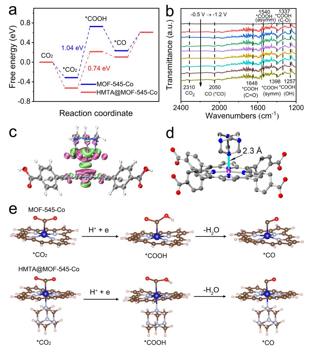 研究表明将富氮助剂(HMTA)引入到卟啉基MOF材料的孔道中,增强了催化中心与CO2分子的相互作用。改性后的HMTA@MOF-545-Co对CO2的吸附焓和CO2电还原的催化效率均提高了2倍左右(FECO> 99%),阻抗值大大降低。在可见光照射下HMTA@MOF-545-Co显示了更优越的电催化性能(FECO≈100%,-0.7 V),FECO值并在宽电位范围(-0.7 V ~ -1.1 V)内达到90%以上,表现出较高CO生成速率(5.11 mol m-2h-1,-1.1 V)和高能量利用效率 (70%,-0.7 V),这些参数超过了大多数优异的电催化剂。HMTA的定向配位可以促进催化位点对CO2的吸附/活化和电子转移,从而大大降低了决速步的能垒,将会促进多孔晶态材料在高效电催化CO2RR领域的发展。