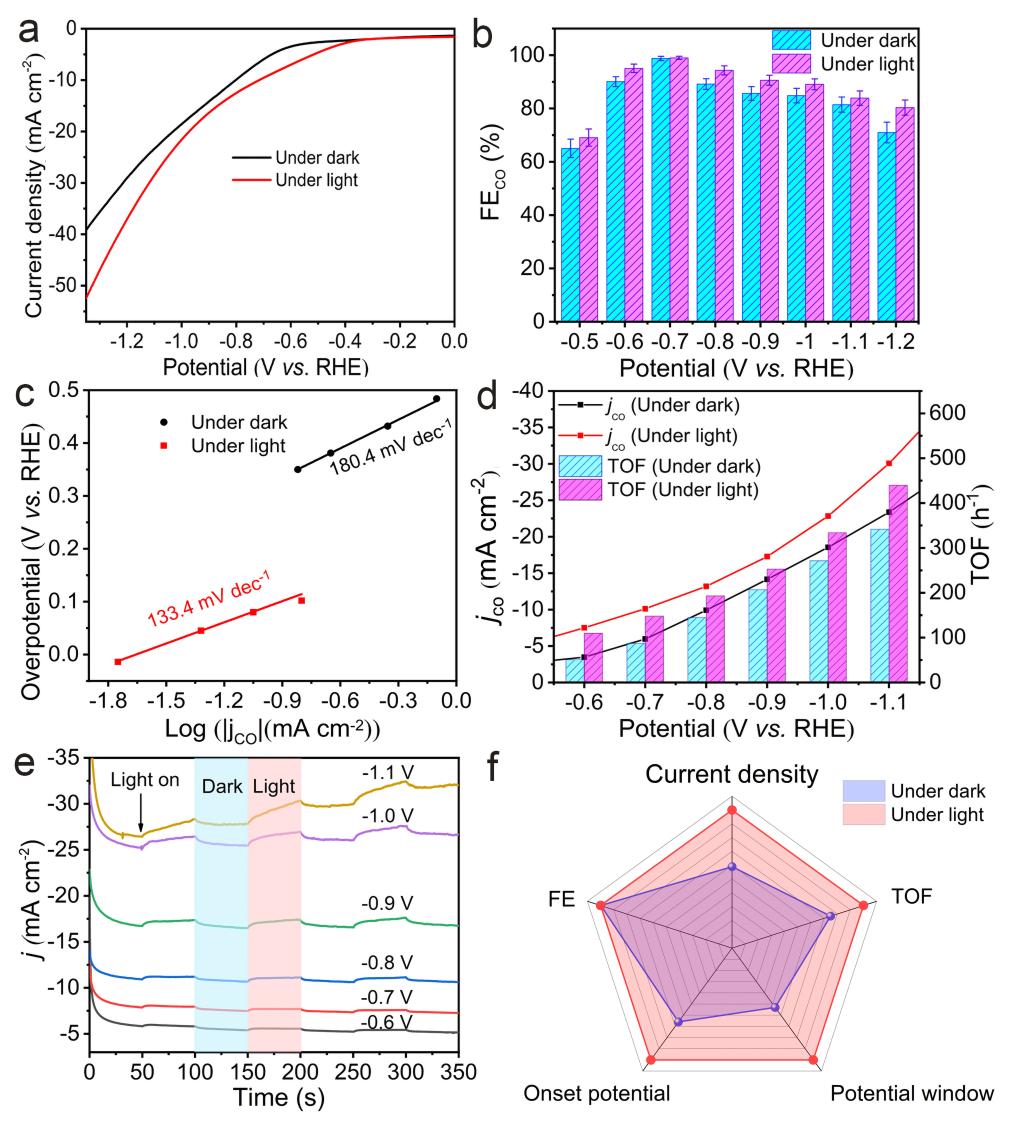 (材料在光辅助下和在黑暗条件下二氧化碳电还原催化性能的对比)