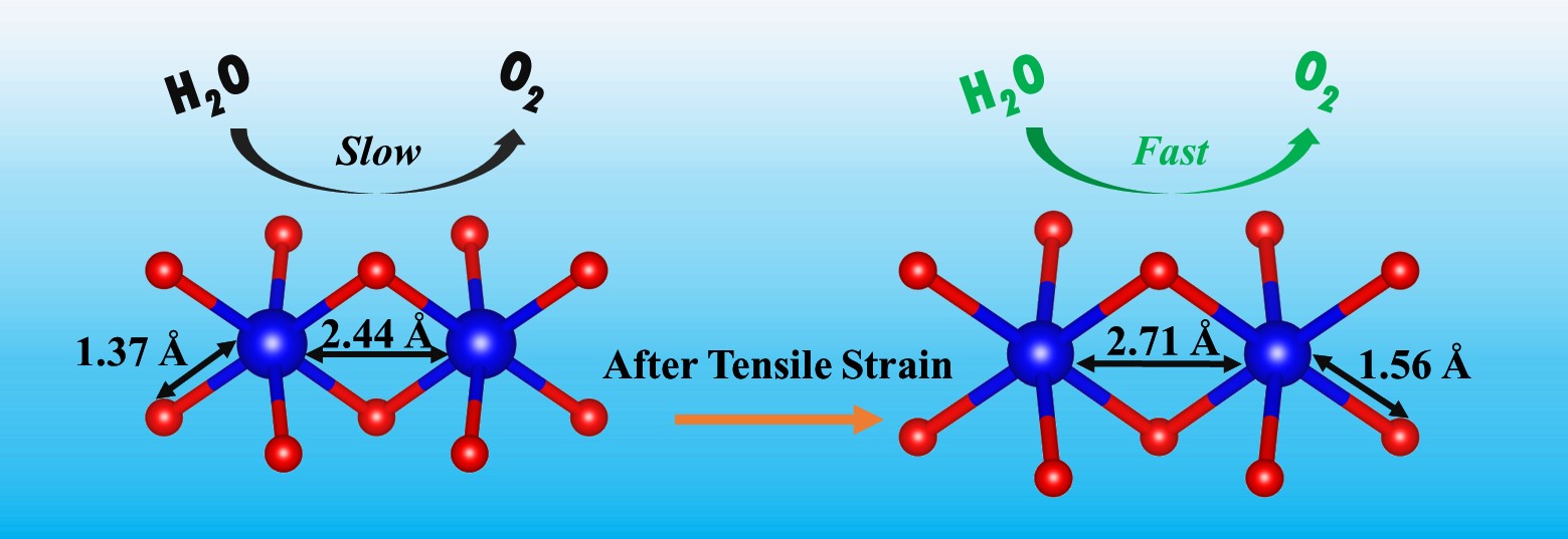 团队采用金属锰替代磷酸钴中部分钴,显著增强了磷酸钴的电催化OER性能。扩展边X射线精细结构(EXAFS)和原位Raman实验表征发现,锰元素的引入可使得磷酸钴晶格发生拉伸应变,有利于*OH的吸附以及催化剂表面快速重构为高催化活性的羟基氧化钴,从而提升了电催化OER性能。相关工作发表在《Journal of Colloid and Interface Science》,2021级硕士生徐欣玥为论文第一作者,陈翔博士、柳东明教授和南京邮电大学朱先军副教授为论文共同通讯作者。