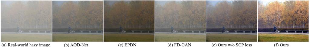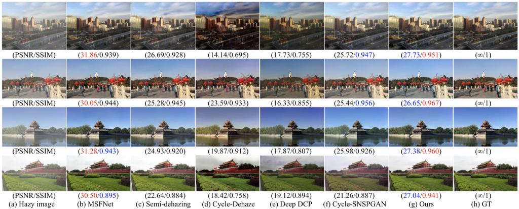 雾作为自然界最常见的一种大气现象,通常会导致获取的图像出现模糊、噪声干扰、颜色退化等问题,影响和限制了各种户外视觉系统的性能,如交通监控,自动驾驶,目标追踪等。因此,从雾天图像恢复出原本的清晰图像是关键且必要的。基于深度学习的方法是当前图像去雾领域的主流方法,这些方法通常采用监督学习框架,基于成对(有雾/清晰)数据进行训练,从输入的雾天图像恢复相应清晰图像。但在真实场景中,这些成对数据的获取极其困难,甚至无法获得,一些方法通过使用物理退化模型或图像处理软件在清晰图像上合成含雾图像,以此来组成配对数据。然而,在“假”合成数据上训练的模型会因为合成数据与真实图像间存在的差异(域间隙),导致网络在真实场景下复原能力降低。