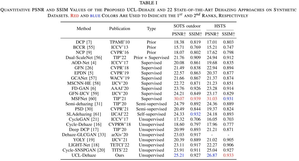(UCL-Dehaze与其它22种去雾方法在SOTS和HSTS数据集上定量比较)