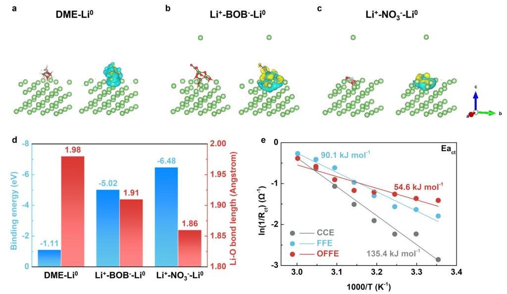 本研究基于新型无氟电解液(OFFE,即1M LiBOB + 0.5M LiNO3 in DME)搭配无氟粘接剂(LA133),开发出兼具绿色环保、高温稳定性及快充性能的无氟锂金属电池。基于综合性能分析与理论计算结合可得,上述性能改善主要归因于无氟电解液高的体相电导率以及原位形成了高稳定、快离子传输的无LiF固体电解质界面。基于OFFE的Li-Cu半电池在60 ℃,3 mA cm-2/3 mAh cm-2的测试条件下具有高达98.8%的库伦效率,并形成致密的锂沉积形貌。如图所示,XPS和TOF-SIMS表明,OFFE能够在锂负极表面生成稳定的无LiF界面,该界面主要成分包括LiBxOy,Li2O和LiNxOy/Li3N,形成的B/O/N复合界面具有优异的稳定性和快速锂离子传输能力,从而实现锂离子的均匀沉积。
