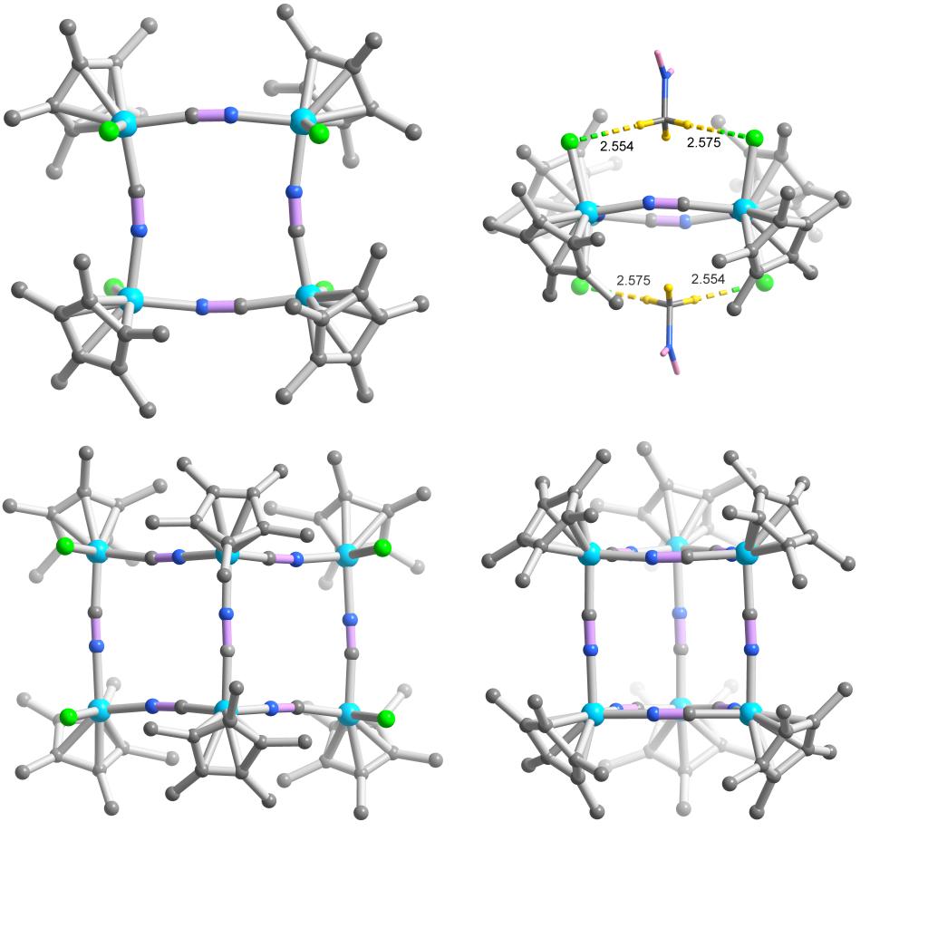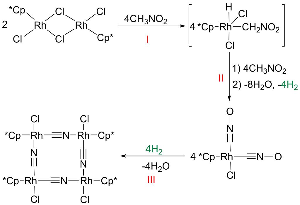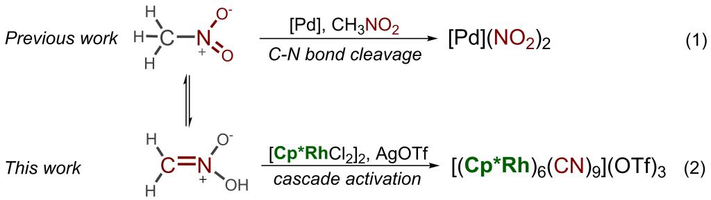 在金属催化剂的作用下,硝基甲烷通常会分解成硝基,从而生成硝基金属化合物。例如,使用(Mediimine)Pd(NO2)2催化剂可以将硝基甲烷分解成[Pd](NO2)2配合物。需要注意的是:1)在金属催化剂存在的情况下,目前尚未有关硝基甲烷直接分解成氰根以生成普鲁士蓝(PB)类似物的研究报道;2)基于半夹心结构的PB类似物通常是使用具有剧毒性质的氰化物合成的。本研究提出了一种简单便捷的合成氰化物途径:利用易于合成的[Cp*RhCl2]2催化剂活化硝基甲烷,从而构筑类似普鲁士蓝的金属有机笼。该策略克服了过去形成腈化物所需的苛刻条件,揭示了一种新的硝基甲烷活化机制,即在生成腈根的同时原位组装金属有机笼,期待在未来的合成化学中得到广泛应用。