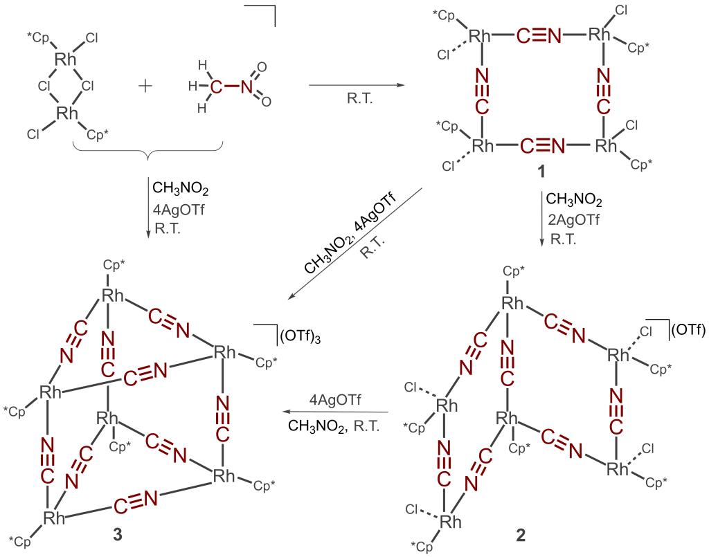 (硝基甲烷活化形成有机金属大环1、分子夹2和金属笼3的合成路线)