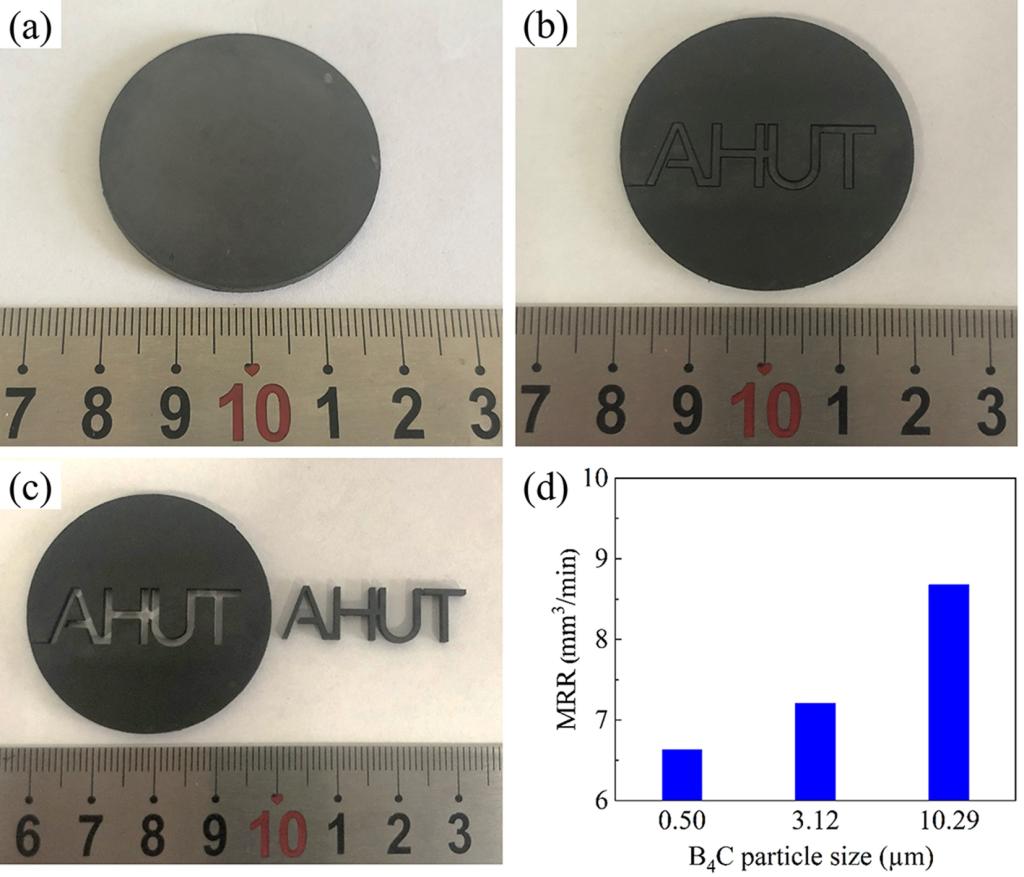 (电火花线切割加工前后样品形貌和材料去除率随原料粒径的变化关系)