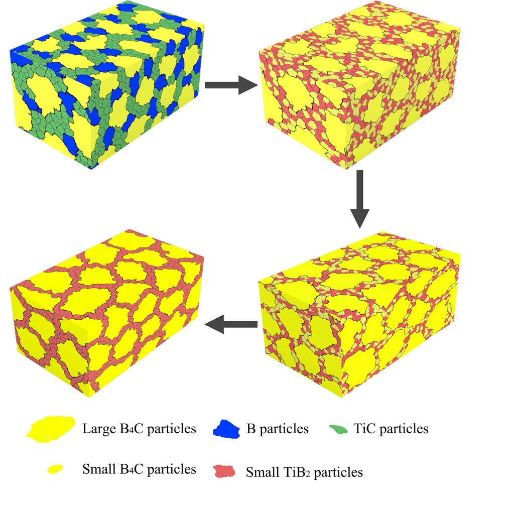 团队进一步根据基体晶粒选择性吸收生长原理,采用两步法设计、制备了力学、电学性能俱佳的“晶界型”B4C‒TiB2复相陶瓷。研究阐明了TiC‒B体系的反应机理及其在基体晶粒选择性吸收生长过程中的作用;揭示了原料粉体粒径与复相陶瓷的显微结构、力学和导电性能间的关联机理。相关成果发表在《Journal of Advanced Ceramics》,2020级博士生赵峻为论文第一作者,冉松林教授和王东副教授为论文共同通讯作者。