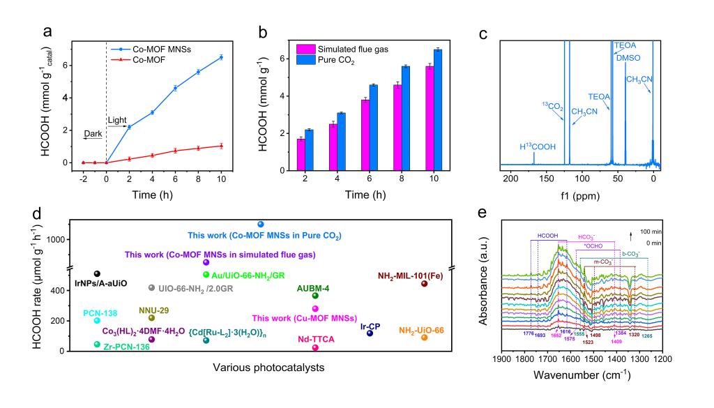 团队设计的Co-MOF-MNSs具有亚纳米厚度、固有的光敏性、CO2选择性吸附性能和完全暴露的Co活性位点,该材料可以选择性地将模拟烟气转化为HCOOH。亚纳米的厚度可以大大减少催化过程中的传质途径,充分暴露的活性位点可以快速捕捉烟道气中的CO2分子。这项工作将有助于开发具有可调形态的多孔晶体材料,用于烟气的高级光催化处理。