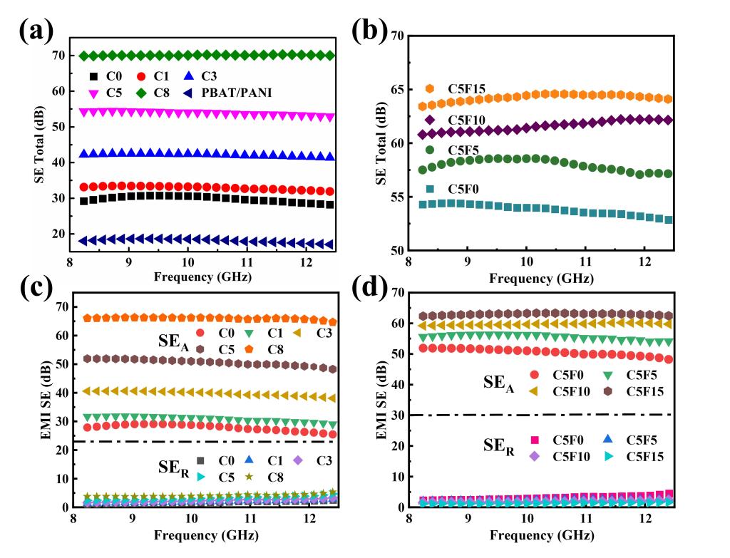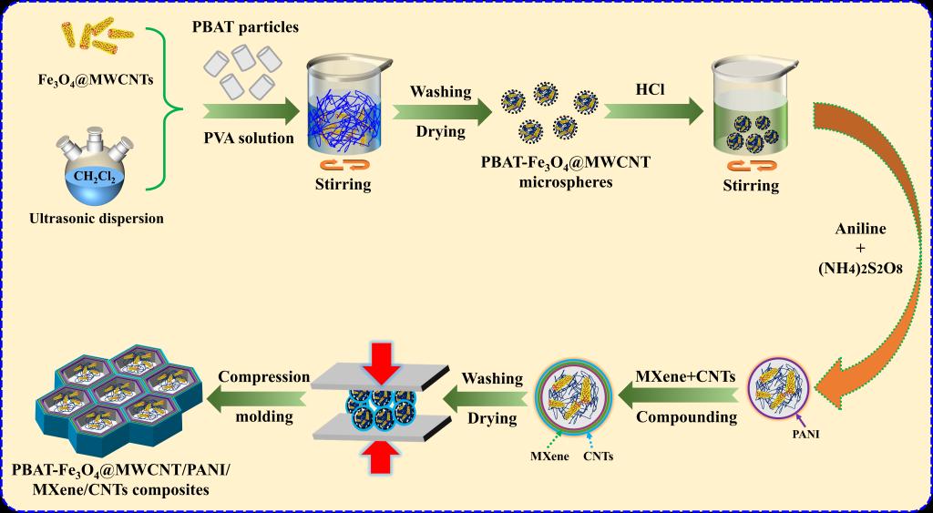 本研究通过逐层包覆和热压工艺制备了具有三维杂化导电网络的聚己二酸/对苯二甲酸丁二酯(PBAT)基电磁屏蔽复合材料,构建的隔离结构网络由原位合成的聚苯胺(PANI)、过渡金属碳化物(MXene)和碳纳米管(CNT)组成,这三种功能填料的协同搭接促进了屏蔽网络的形成。通过引入四氧化三铁负载多壁碳纳米管(Fe3O4@MWCNT)纳米粒子有效降低了电磁波的反射。结果表明,在CNT含量仅为8 wt%时,复合材料的电导率和电磁屏蔽效能分别可达28.9S/m和70.1 dB,对电磁波的反射率低至26%。这种具有生物可降解特性的电磁屏蔽复合材料展现出了良好的屏蔽效率和低反射功能,有望在下一代环保智能型电子设备中得到广泛应用。