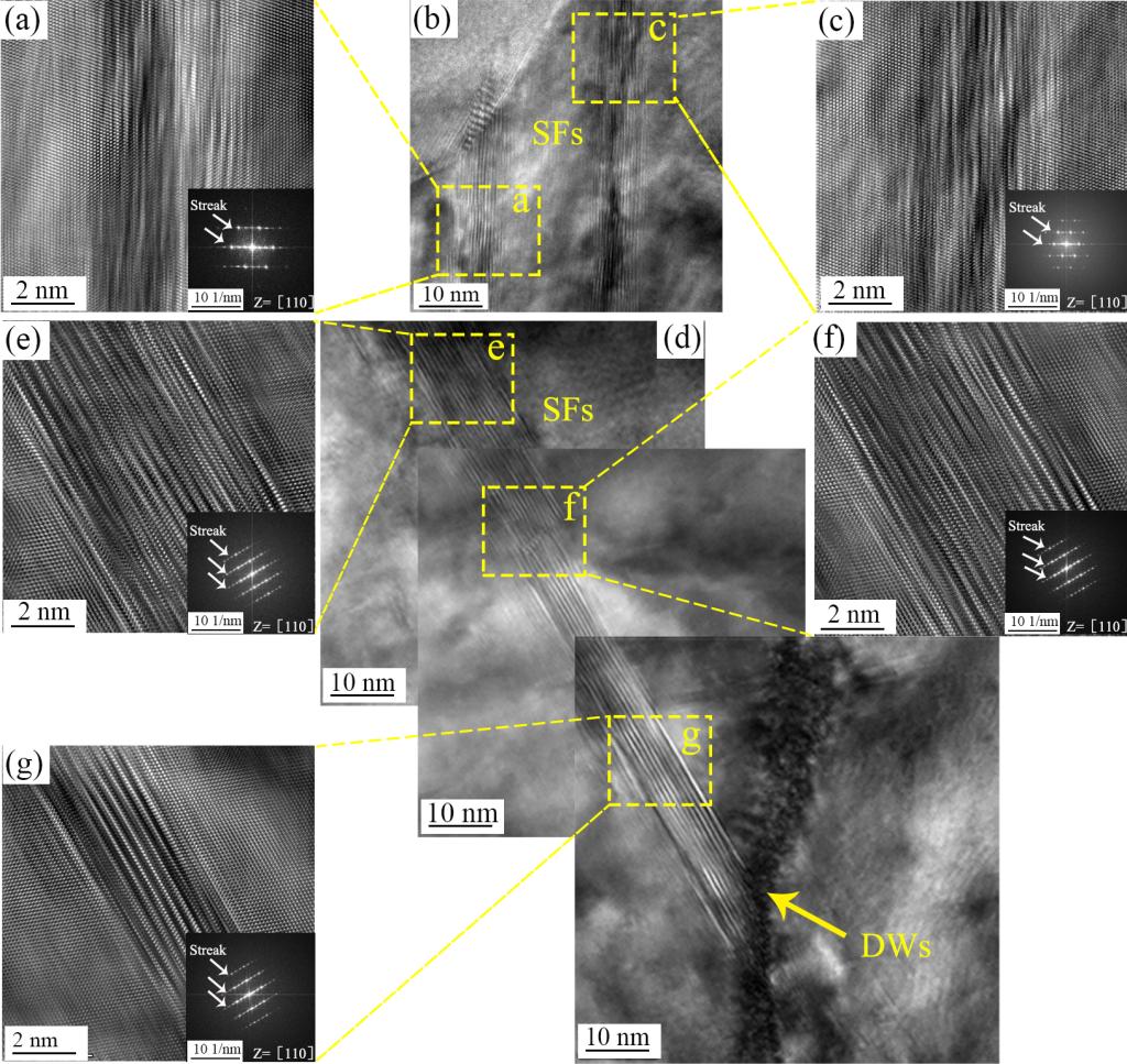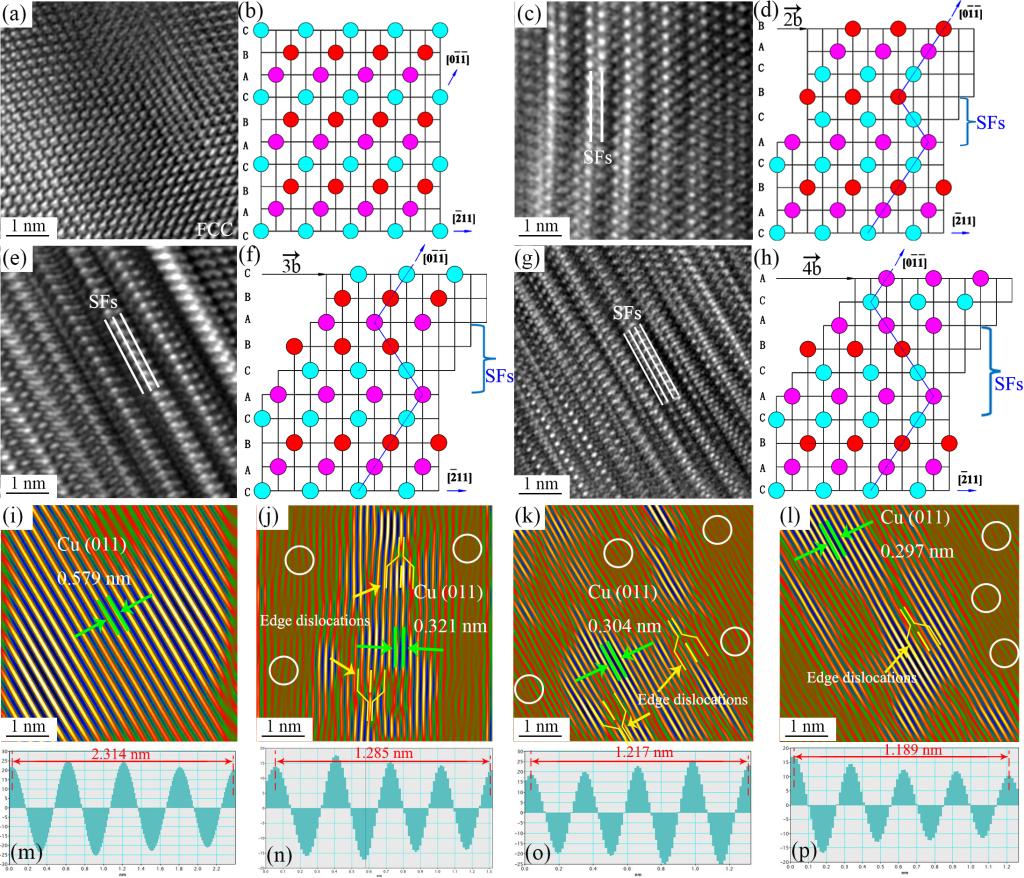 针对上述工程应用需求,课题组采用激光冲击成形+强化的复合方法对薄壁纯铜构件进行塑性精密成形,实现了激光冲击波诱导下材料的高应变率快速成形制造。课题组对成形件的残余应力、微观组织及耐腐蚀性能进行了研究,发现激光冲击实现构件塑性成形的同时,在其表面形成残余压应力,单次激光冲击下成形件的凹面和凸面残余压应力分别为−89.2和−18.7 MPa,再次冲击强化后,成形件凹面和凸面残余压应力增加到−184.4和−35.1 MPa。两次冲击处理后,材料表层晶粒的大小由4.49 μm依次下降至4.27和4.09 μm,小角度晶界数量比例由48.9%分别增加到58.4%和62.4%,成形件表层的晶粒得到了细化。通过透射电镜(TEM)进一步观察到表层存在大量的纳米级变形孪晶、高密度的位错缠绕以及大量连续的层错,而且激光冲击处理后材料面心立方晶体结构原子序列及其间距发生改变。成形件表层形成的超细晶粒和层错等显微组织以及分布的残余压应力,有助于其表面生成致密的氧化亚铜钝化膜,从而显著提高抗腐蚀能力。