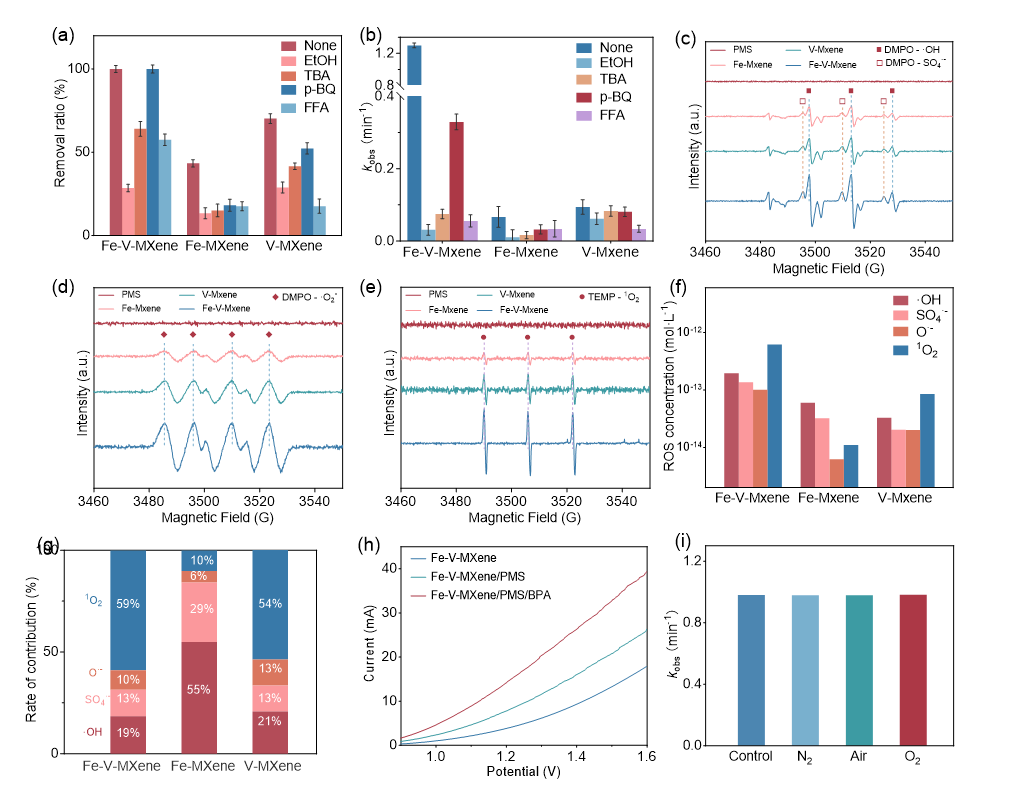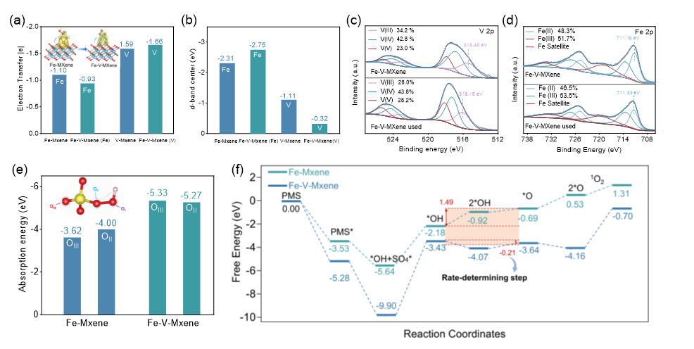 该催化剂可有效活化PMS,6min内可实现水中BPA的完全去除,同时可将光伏废水难降解有机物的去除效率提高到70%以上,表现出优异的催化性能。实验结果证实,与单位点体系相比,Fe-V-MXene/PMS中·OH、SO4·-、1O2的稳态浓度有明显提高。机理分析表明,所形成的Fe-V双位点通过电子转移显著优化了电子结构。V位点将电子转移至相邻的Fe位点,使V位点的d带中心正向移动,改善了V位点的电子密度。这种电子重分布增强了V位点对PMS的吸附和活化能力,并以较低的反应能垒优化了Fe-V位点1O2选择性生成能力。此外,双金属位点间的过度电子转移会引起电子重分布,可能抑制催化反应活性,在Fe-Mn-MXene/PMS体系中得到了证实。