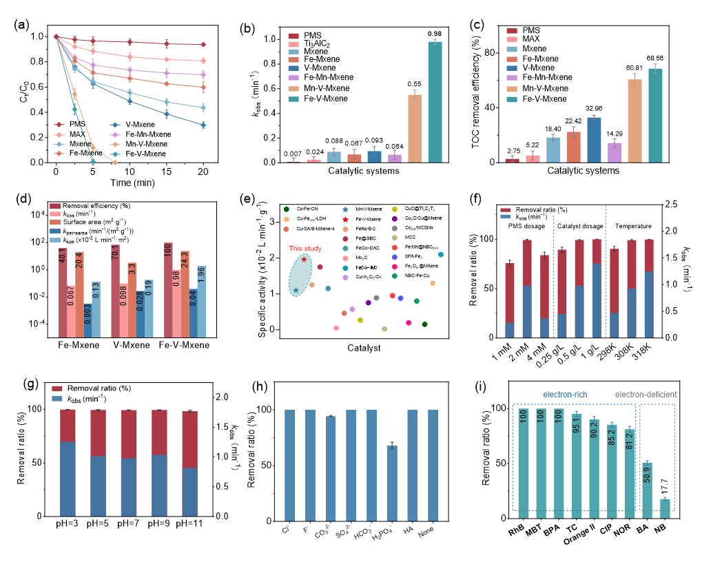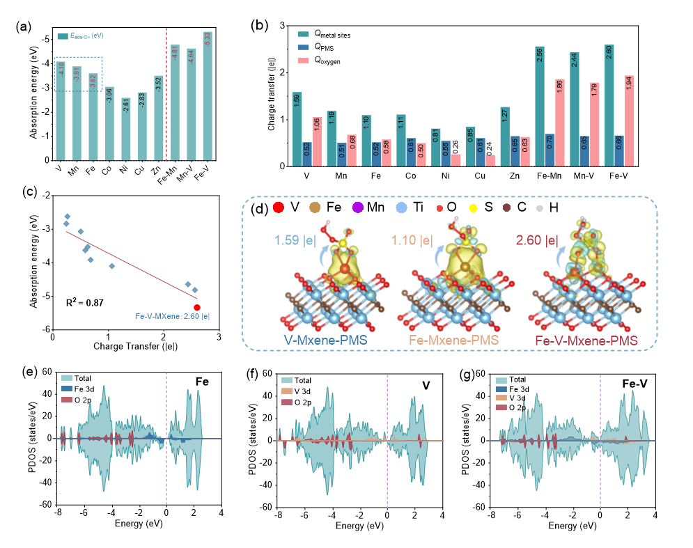 基于双位点催化剂(DSCs)的类芬顿反应技术日益兴起,为可持续水质净化提供了新的解决方案。然而,由于DSCs复杂的电子结构和反应机理,双位点的调控设计仍然具有挑战性,尤其是在众多过渡金属元素中如何快速筛选出具有优异协同催化作用的金属配对成为催化剂设计的关键环节。本研究以密度泛函理论计算结果中的吸附能和电荷转移量为描述符,提出了快速筛选金属配对的新方法,并以MXene为载体,构建了Fe-V双位点,制备出高效催化PMS产生大量活性物种的催化剂Fe-V-MXene,实现了水中新污染物双酚A(BPA)以及光伏废水中难降解有机物的高效净化。