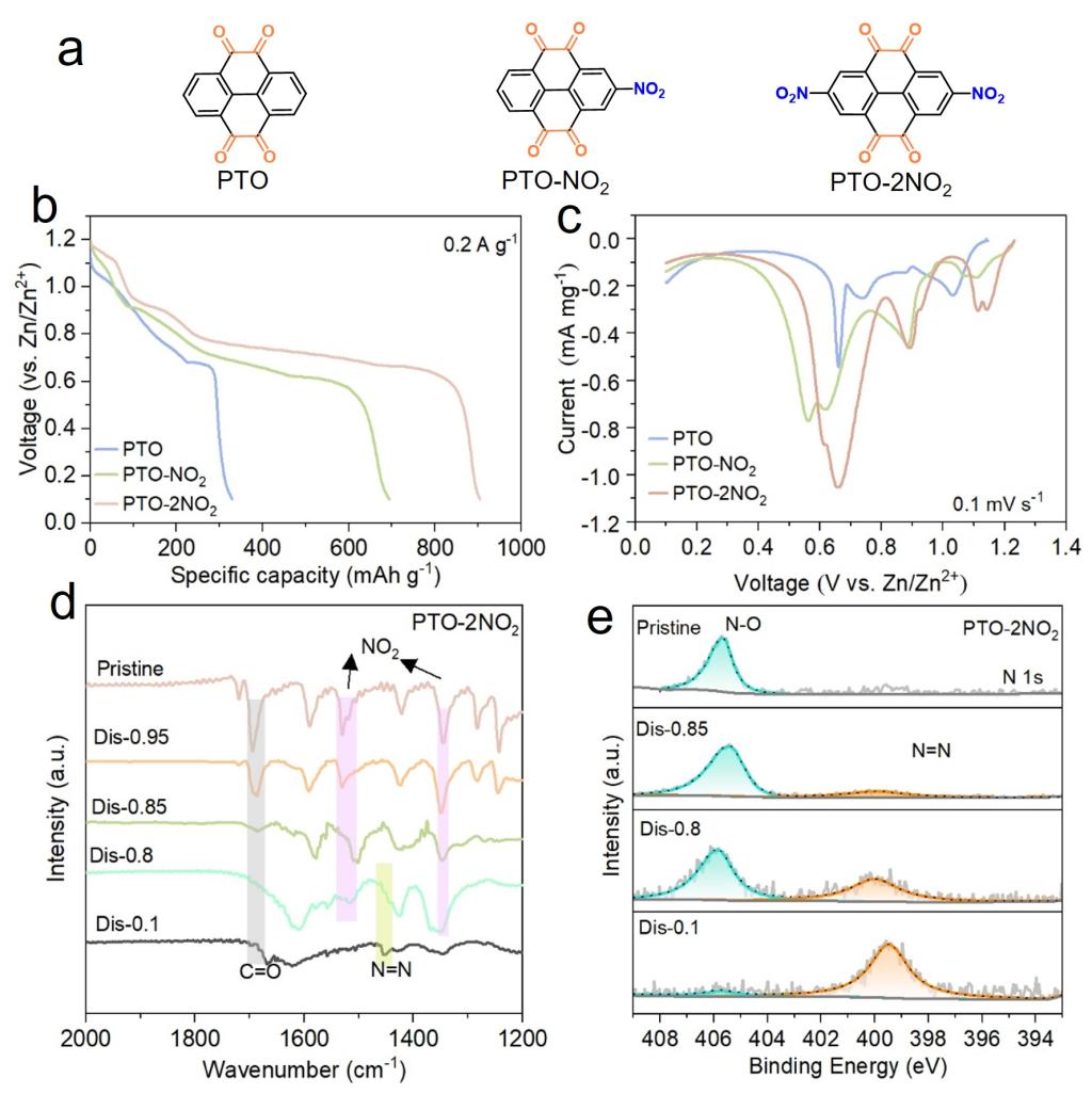 传统的羰基和亚胺基有机化合物基于其电子转移反应,容量和能量密度有限,因此亟需开发新型的具有多电子转换反应的官能团。有机硝基化合物基于其两电子氧化还原反应已在锂离子电池中表现出高达~500 mAh g−1的比容量,研究表明,每个硝基上的两个氧原子可同时与一个锌离子相结合,或每个氧原子分别结合一个锂离子。团队研究了硝基化对芘-4,5,9,10-四酮(PTO)的改善效应,实现了循环寿命和动力学的提升。在0.8-1.5 V电压范围内,硝基的吸电子效应可显著提高羰基基团的放电电压。在0.1-1.5 V电压范围内,硝基的四电子转移特征可提高首次放电容量,实现了905 mAh g⁻¹的超高比容量。该四电子反应对应于硝基向偶氮基的新型电化学转化,这一转化可原位构筑偶氮桥联的共轭多羰基有机电极材料(PTO-Azo),从而避免PTO在低电流下的快速溶解现象,实现循环稳定性的大幅提升。此外,偶氮链接的聚合物可显著降低未占据分子轨道能量和带隙,促进电子和离子传输,改善反应动力学。