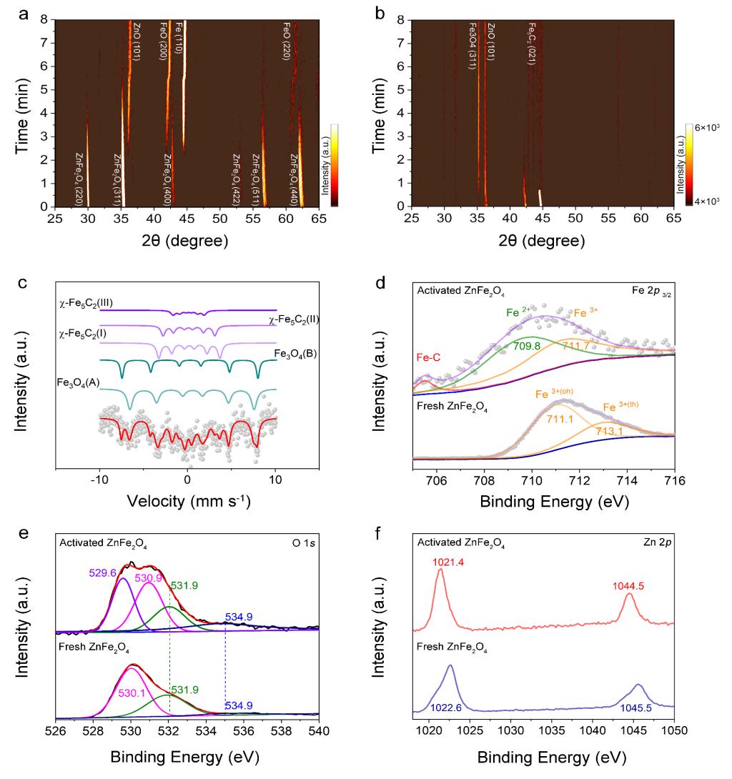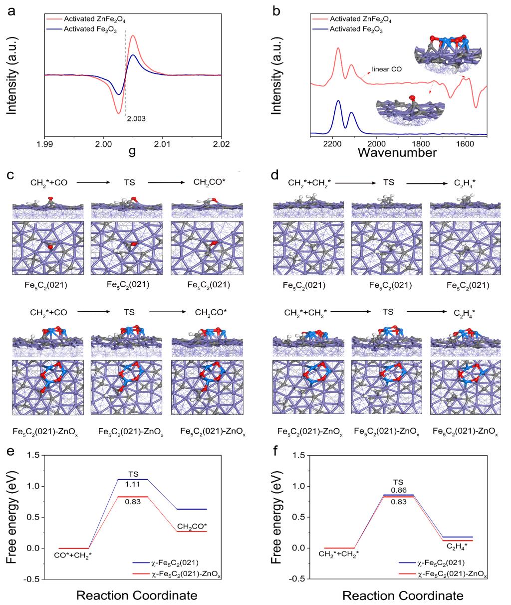 为了突破收率瓶颈,曾杰教授团队开发了一种熔盐辅助策略,构建了富含界面位点的铁锌催化剂,实现了高达31.7%的二氧化碳加氢制液体燃料单程收率世界纪录,经过500小时的连续运行,该催化剂的性能依然保持稳定。机理研究表明,碳化物与一氧化碳插入路径的协同作用促进了碳链增长。铁基催化剂中,锌元素的引入一方面会增加表面氧空位数量,促进二氧化碳的活化。另一方面,铁-锌形成的界面作为一氧化碳非解离吸附位点,提供了一氧化碳插入的碳链增长新路径,从而有效抑制了一氧化碳和甲烷等C1副产物的生成。研究工作深化了对二氧化碳加氢反应的理解,为后续的催化剂设计提供了理论依据。