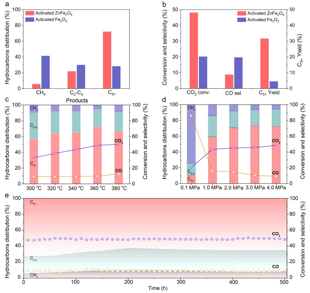 二氧化碳分子具有较高的热力学稳定性和显著的化学惰性,其活化过程本身极具挑战。由于二氧化碳加氢生成液体燃料是一个放热反应,直接提高反应温度不仅会降低二氧化碳的平衡转化率,还会降低目标产物的选择性。在二氧化碳加氢过程中,尤其在高温时,逆水煤气变换反应难以避免,会导致一氧化碳选择性升高,副产物甲烷的选择性常常超过15%。为抑制C1副产物的选择性,人们开发了多种方法,如疏水封装、引入碱金属添加剂、掺杂电子调节剂等,但这些催化剂往往受限于较低的二氧化碳转化率,致使液体燃料收率有限。截止到该工作报道之前,二氧化碳加氢制液体燃料的单程收率未超过30%。