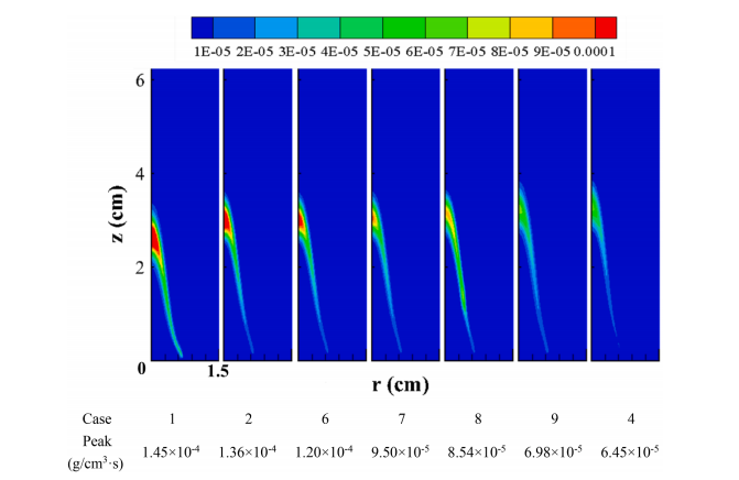 (乙烯掺氢氨燃烧碳烟凝结速率分布)