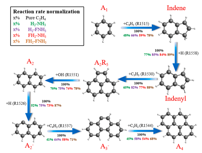 团队结合气相反应机制与虚拟组分设定,在多种火焰条件下研究乙烯/氢气/氨气层流扩散火焰。通过实验数据和模拟结果对比分析发现,掺氢氨能够抑制乙烯火焰中碳烟生成,且抑制效果随氢氨比降低而增强,主要源于稀释和化学效应。研究进一步分析碳烟生成各阶段,发现氢氨燃料对碳烟核化、表面生长和凝聚过程均有抑制,其中核化和表面生长对碳烟浓度减少的影响更明显;确定了从苯到芘的关键形成路径,揭示掺氢氨气通过降低关键反应速率,尤其是抑制萘的氢提取反应,减少芘生成,进而抑制多环芳烃形成和生长。