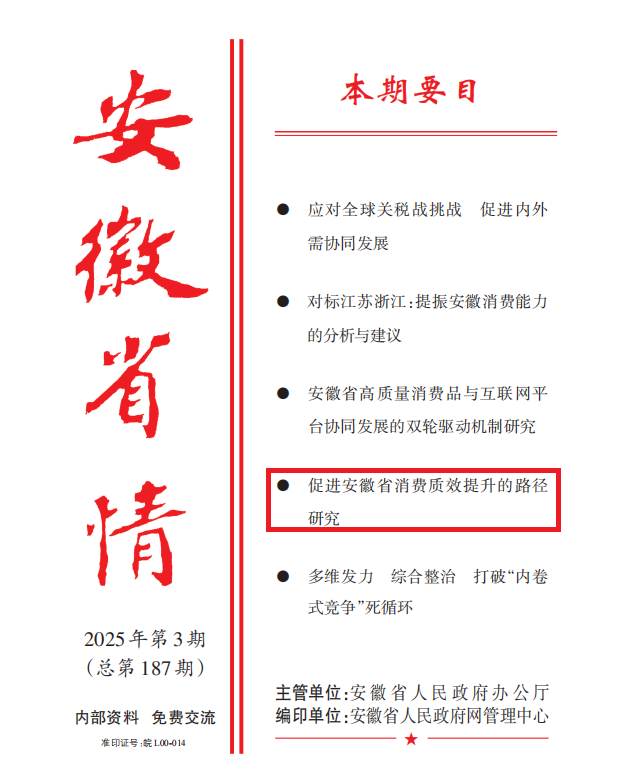 近日,必赢商学院方大春教授撰写的资政文章《促进安徽省消费质效提升的路径研究》,被安徽省人民政府办公厅内刊《安徽省情》(2025年第3期)“特别关注”专栏刊载。